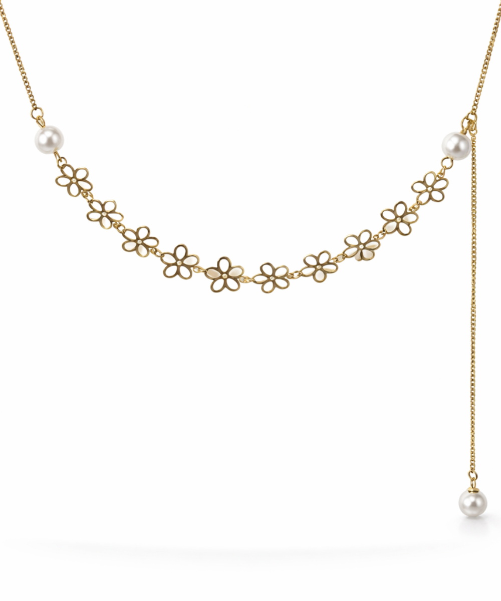 18K gold-plated floral pearl necklace crafted from 316 stainless steel, featuring delicate open-flower motifs accented with lustrous pearl drops, designed.