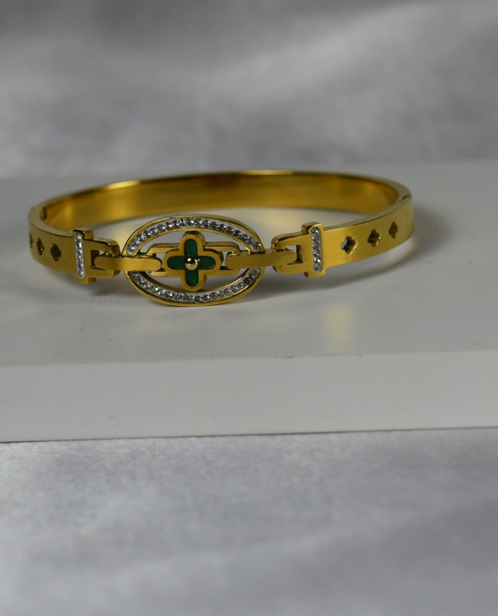 Embrace timeless charm with the 18K Gold Plated Emerald Clover Bangle from Aangan Studios.