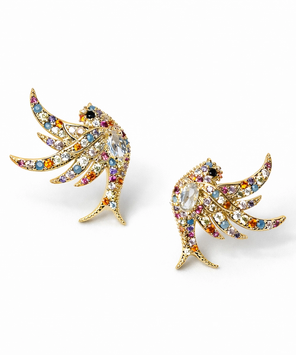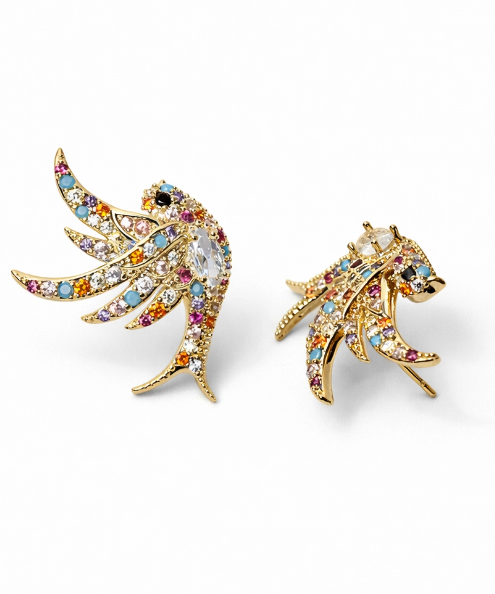 18K gold-plated multicolor bird stud earrings crafted from 316 stainless steel, featuring a sparkling crystal-studded wing design with vibrant multicolor stone detailing and a clear pear-cut centerpiece, designed with a comfort-lightweight fit, all-day skin comfort, & long-lasting shine.