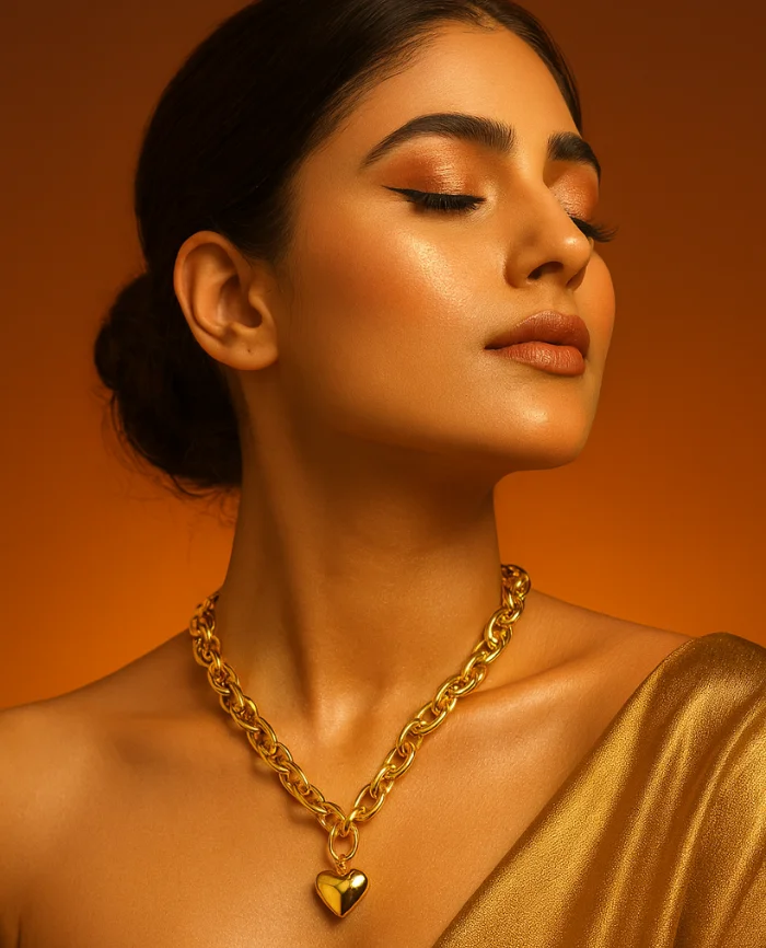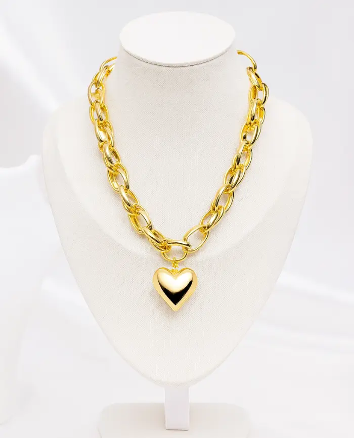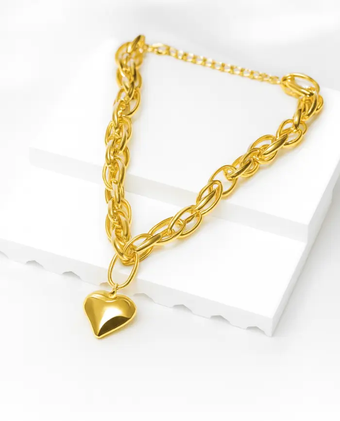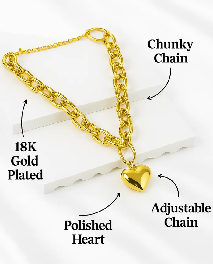 Crafted from 316L stainless steel with 18K premium gold plating, it features a sculpted heart pendant and chunky mirror-polished links that shine like real gold. Anti-tarnish, waterproof, and hypoallergenic