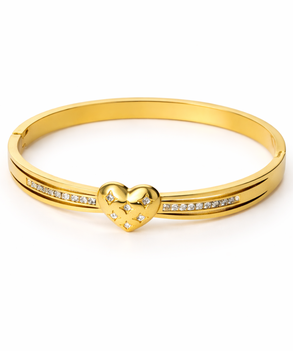 18K gold-plated heart crystal bangle bracelet crafted from 316 stainless steel, featuring a sleek polished band with a raised heart centerpiece and sparkling crystal accents along the sides, designed with a comfort-lightweight fit, all-day skin comfort, and long-lasting shine.