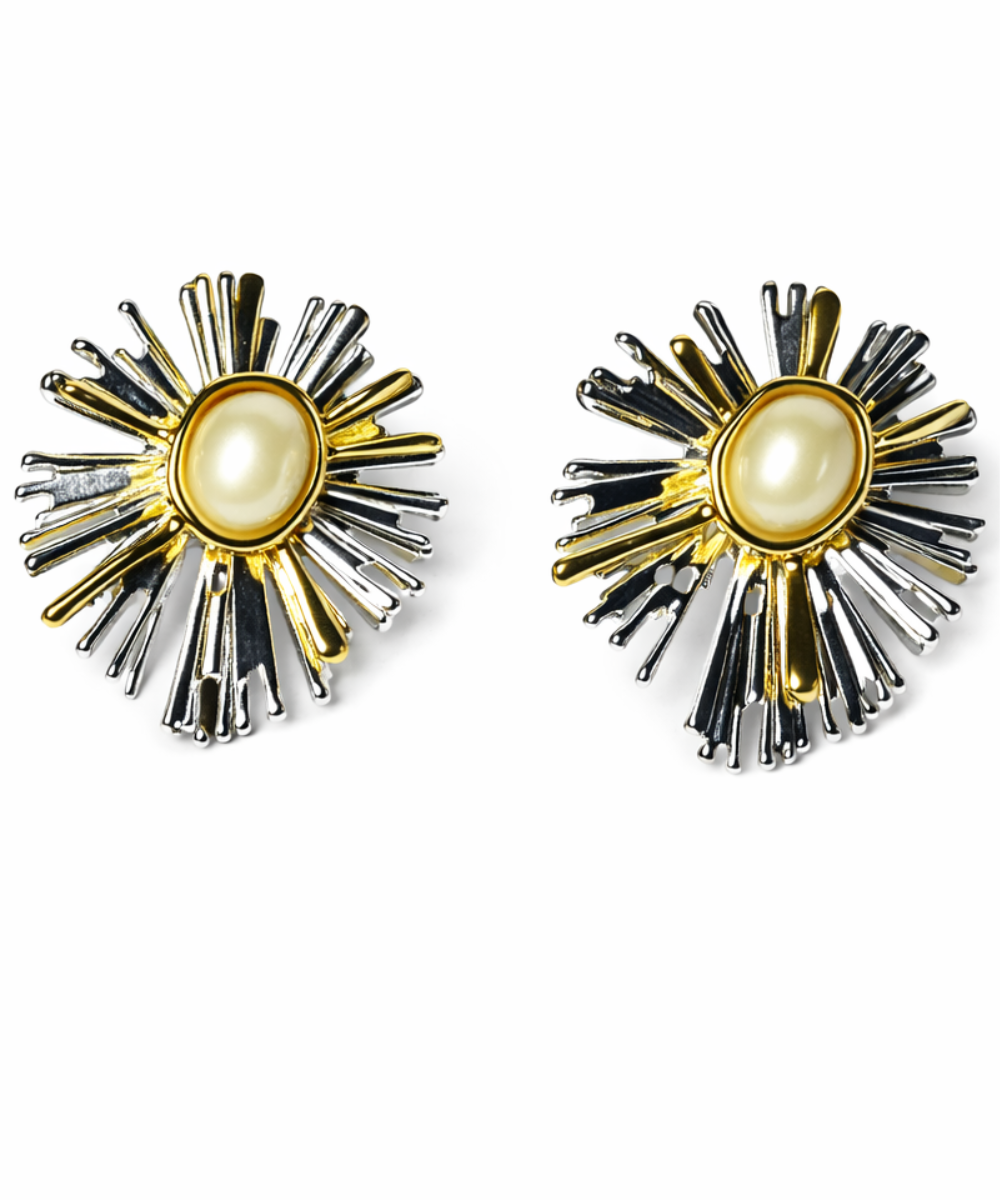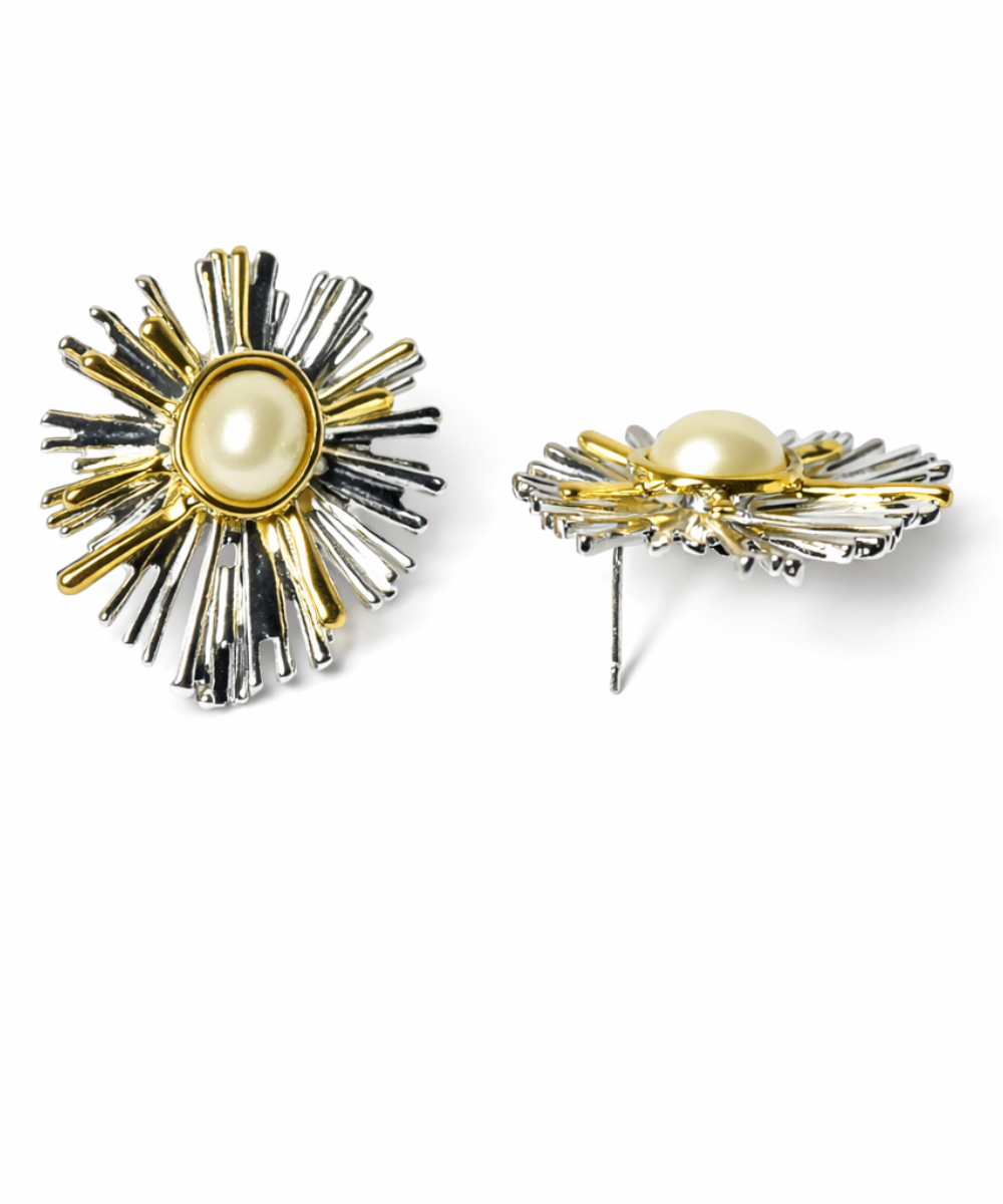 18K gold-plated dual-tone sunburst stud earrings crafted from 316 stainless steel, featuring a radiant layered spike design with a luminous pearl centerpiece and a high-gloss polished finish.