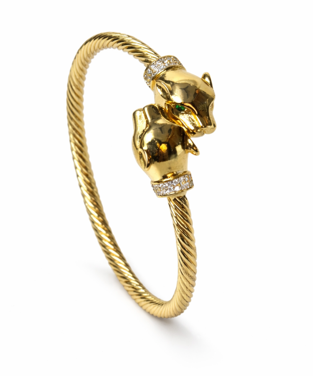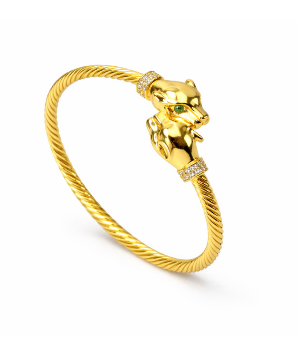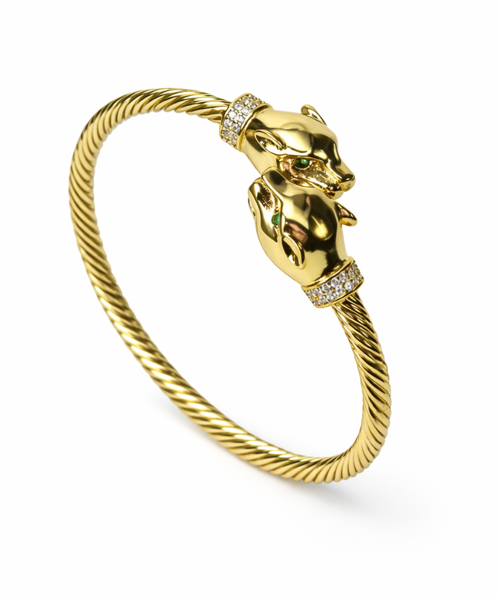 18K gold-plated twin panther cuff bracelet crafted from 316 stainless steel, featuring a twisted rope-style bangle with dual panther head ends accented with sparkling crystal collars in a polished gold finish, designed with a comfort-lightweight fit, all-day skin comfort, and long-lasting shine.