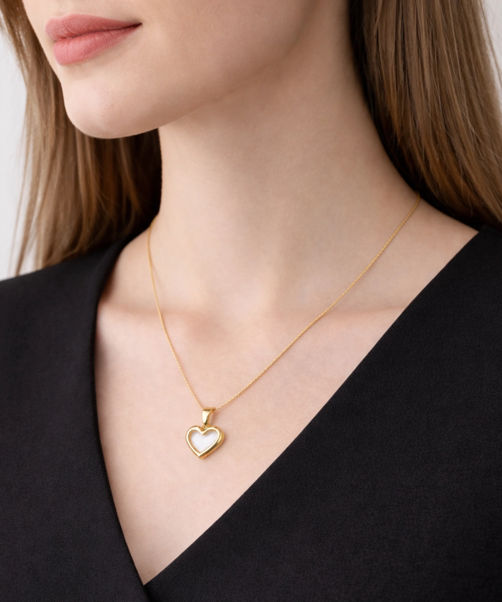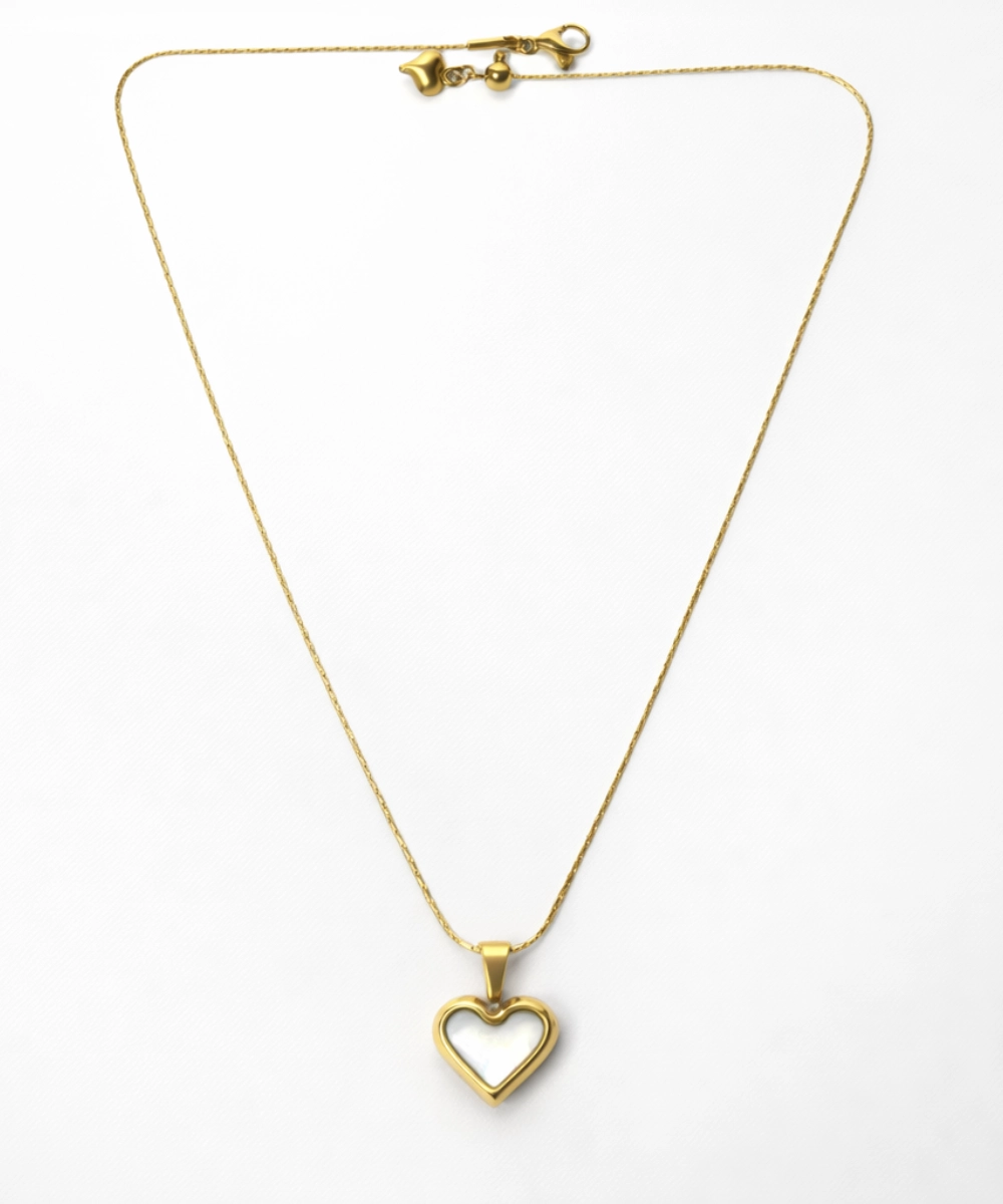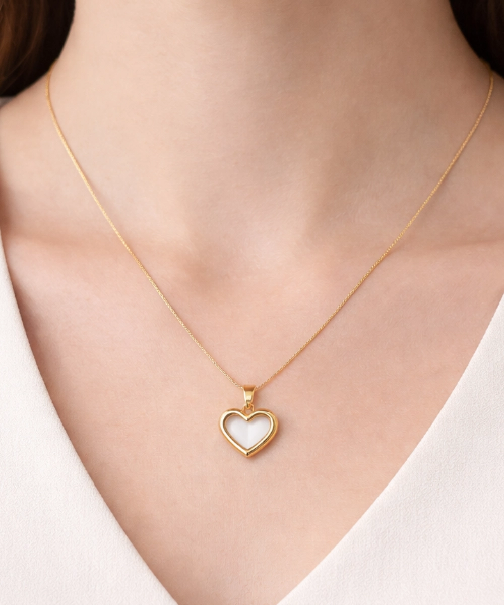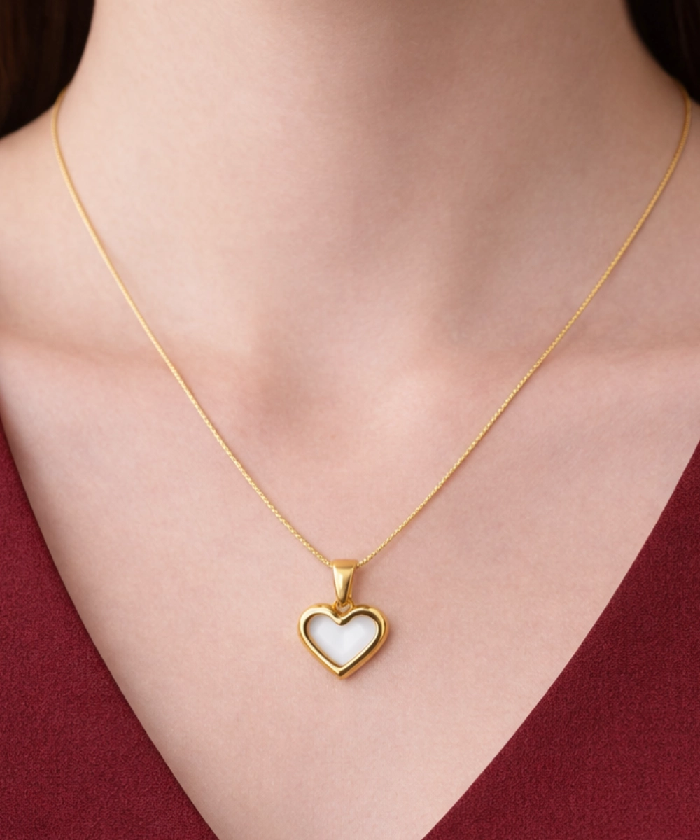 18K gold-plated white heart pendant necklace crafted from 316 stainless steel, featuring a glossy white enamel heart framed in a polished gold outline, with a comfort-lightweight design, all-day skin comfort, and long-lasting shine.