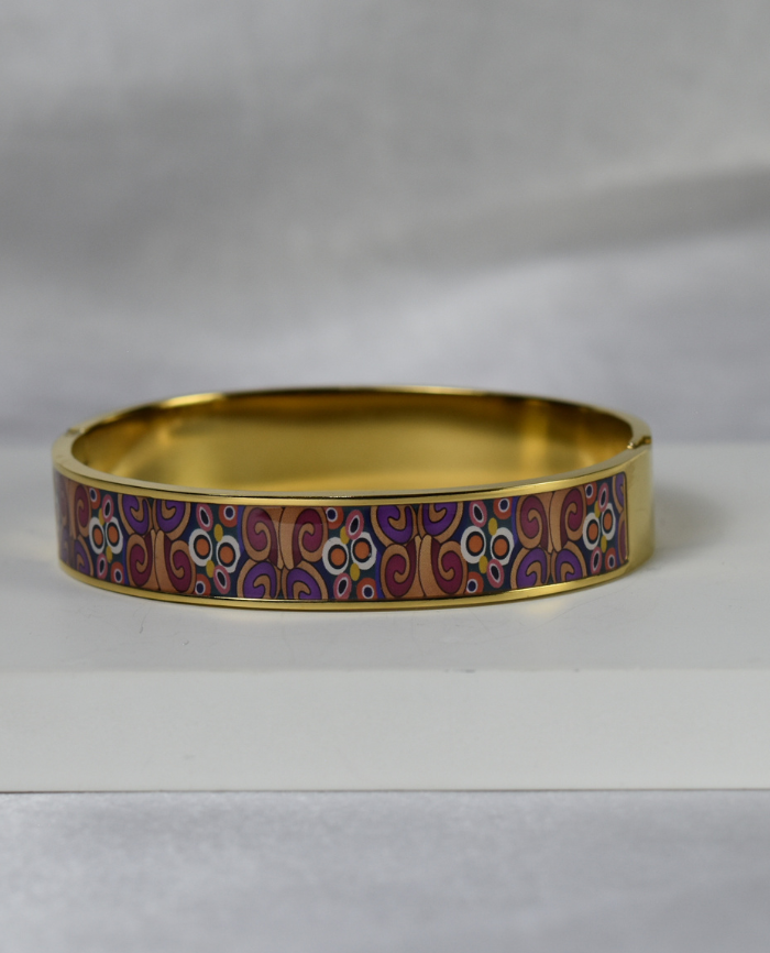 Crafted in 316L stainless steel with an anti-tarnish nano layer, it features a vibrant enamel pattern in shades of purple, red, and orange