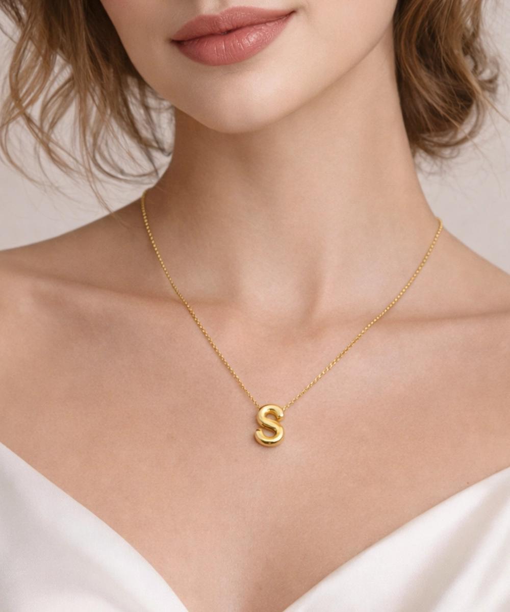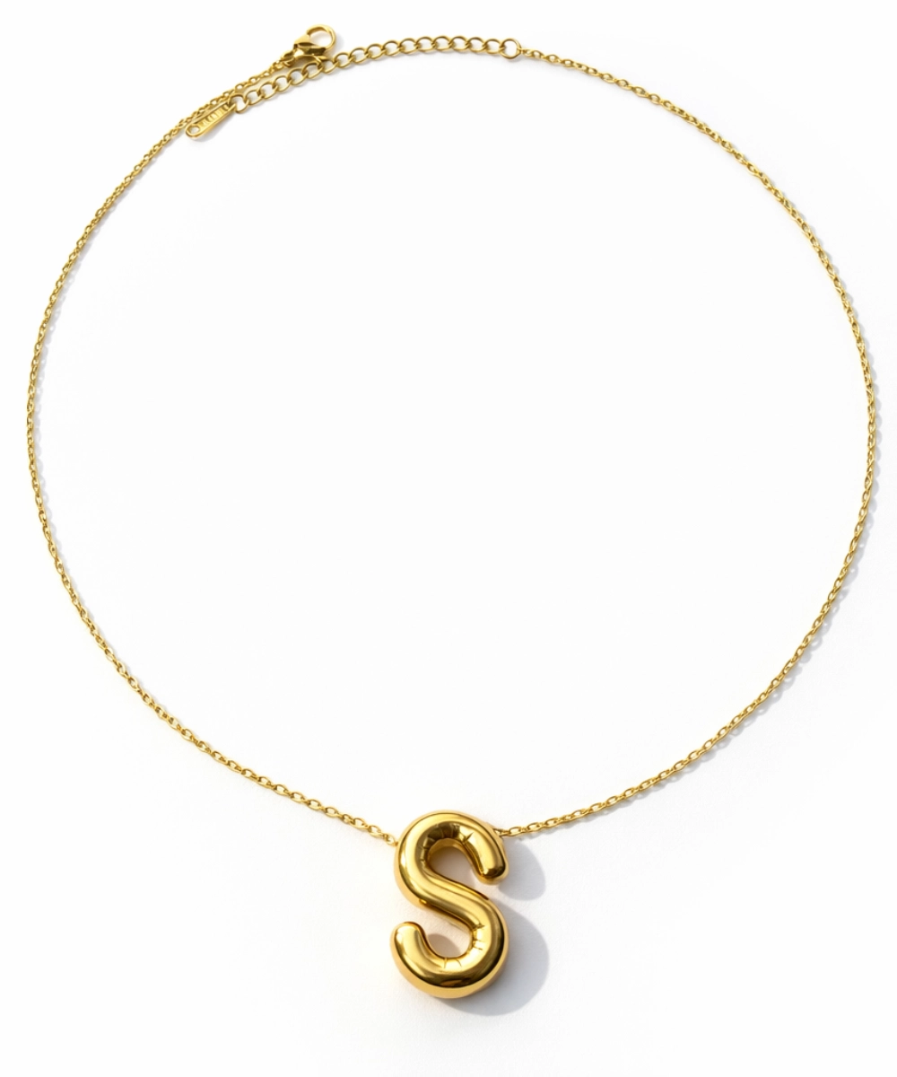 18K gold-plated S initial pendant necklace crafted from 316 stainless steel, featuring a sleek high-polish alphabet design with a comfort-lightweight build, all-day skin comfort, and long-lasting shine.