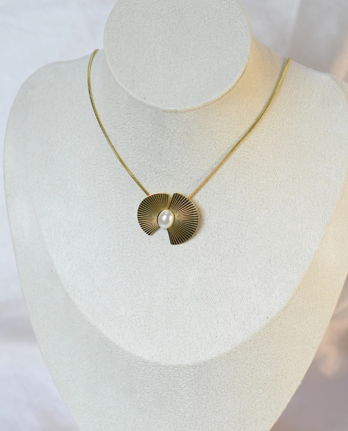 Crafted in 316L stainless steel with an anti-tarnish nano layer, it features a sculpted fan-shaped pendant adorned with a lustrous pearl on a sleek snake chain.
