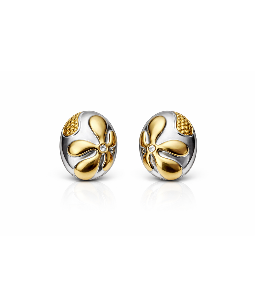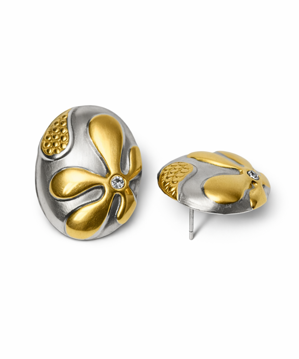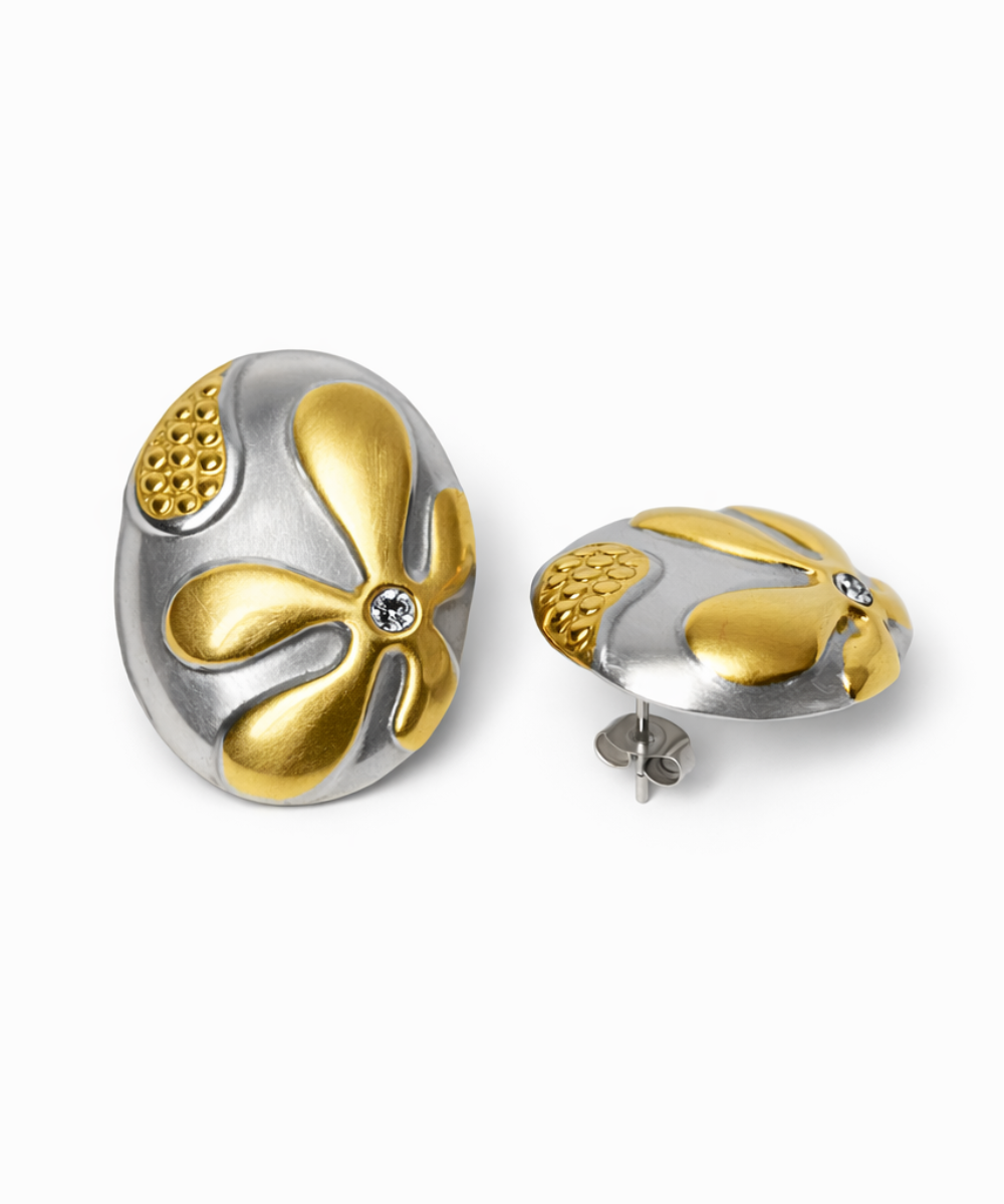 18K gold-plated dual-tone stud earrings crafted from 316 stainless steel, featuring a sculpted floral swirl design with silver accents and subtle crystal detailing.