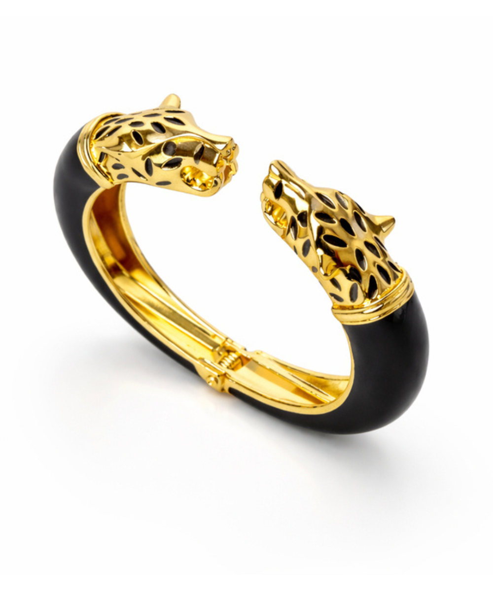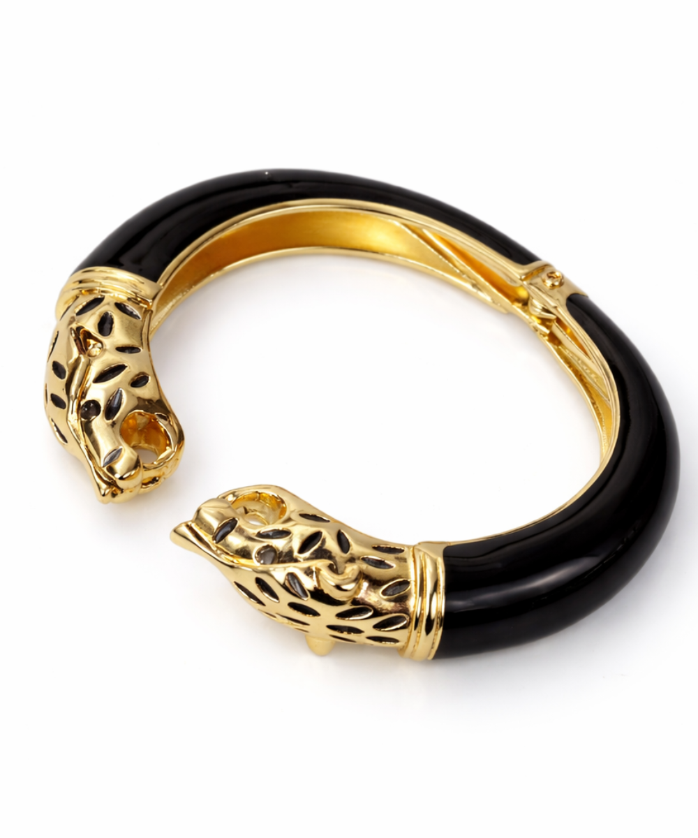 18K gold-plated panther cuff bracelet crafted from 316 stainless steel, featuring a bold black enamel band with dual panther head ends finished in polished gold and sleek black spotted detailing, designed with a comfort-lightweight fit, all-day skin comfort, and long-lasting shine.
