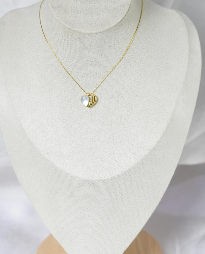 Made from 316L stainless steel with an anti-tarnish nano layer, it features a half-pearl, half-gold heart pendant accented with fine crystals.