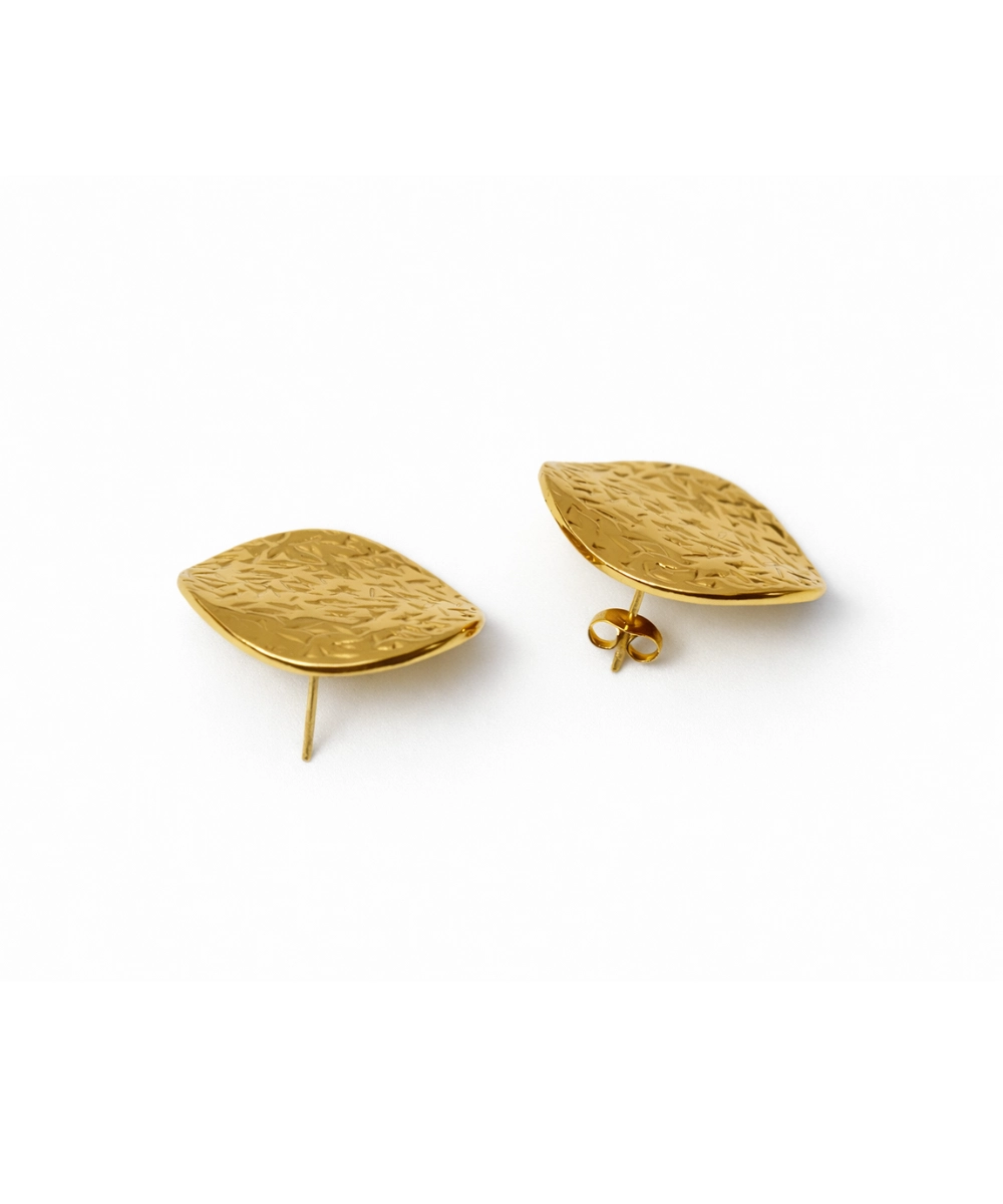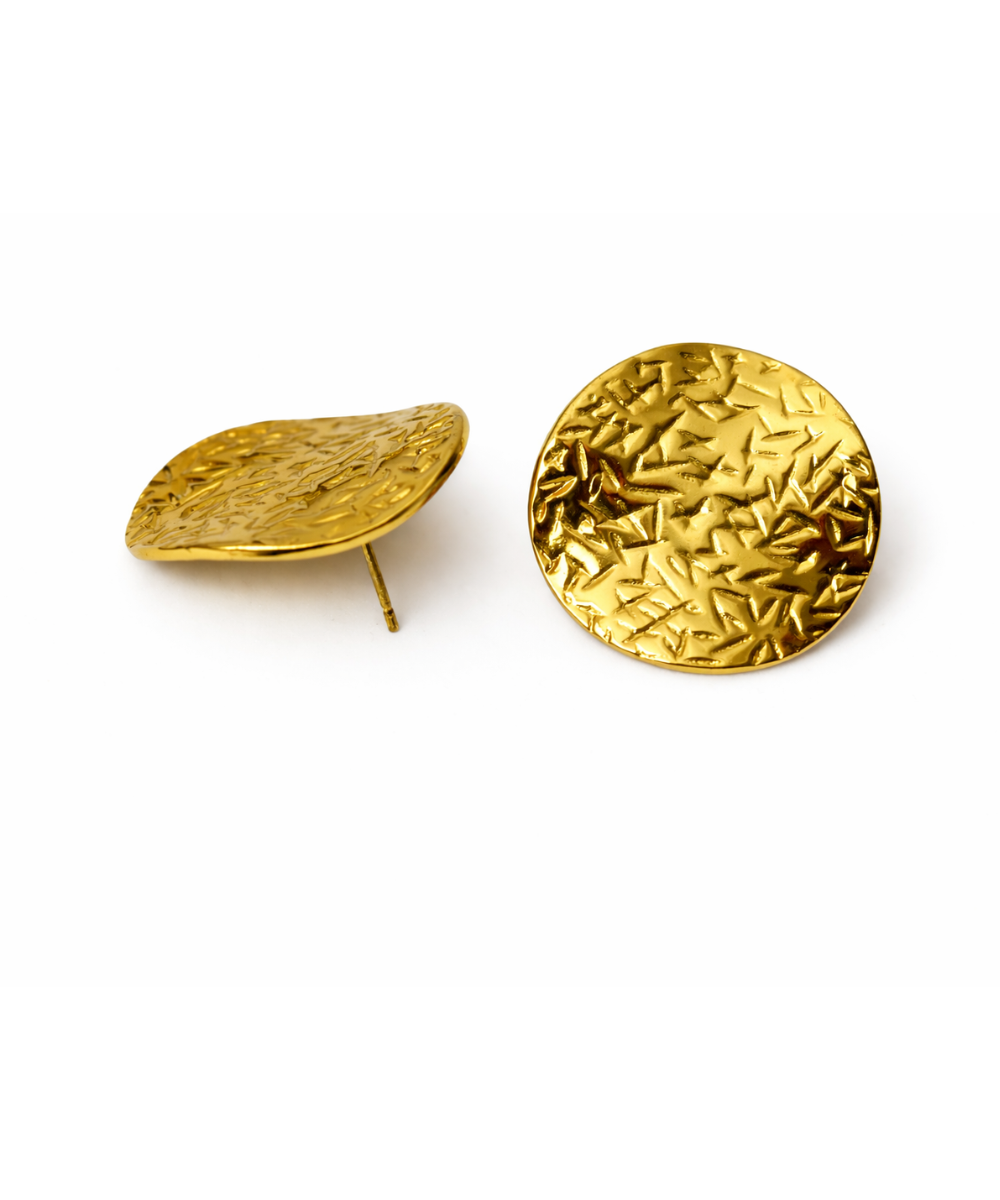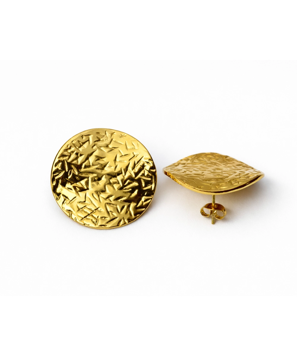 18K gold-plated textured round stud earrings crafted from 316 stainless steel, featuring a hammered abstract pattern with a high-gloss polished finish, offering a comfort-lightweight fit, all-day skin comfort, and long-lasting shine.