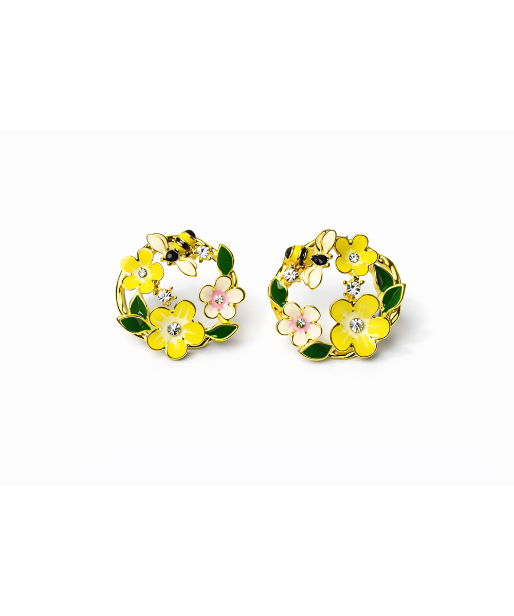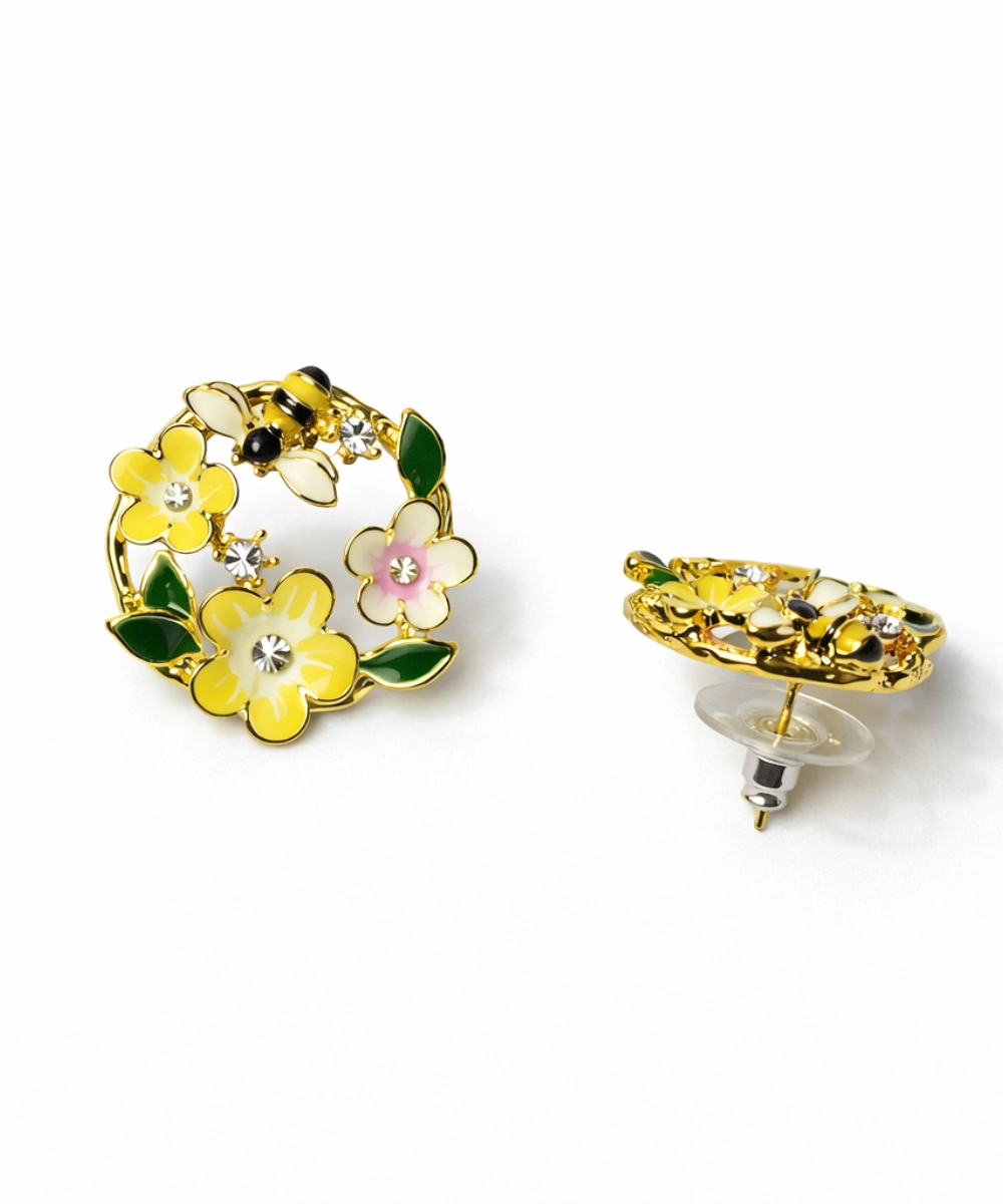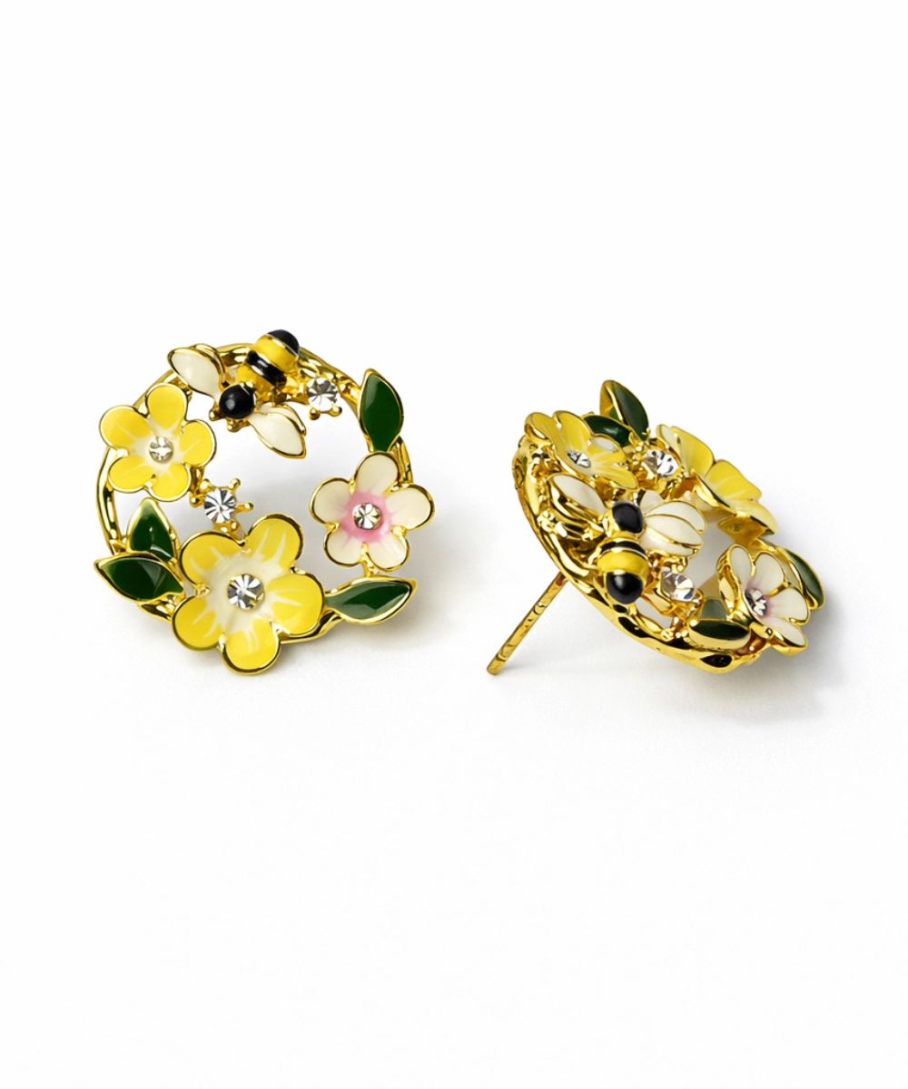 18K gold-plated floral bee stud earrings crafted from 316 stainless steel, featuring a vibrant enamel flower wreath design with yellow and blush floral accents, green leaf detailing, and sparkling crystal highlights topped with a cute bee motif, designed with a comfort-lightweight fit, all-day skin comfort, and long-lasting shine.