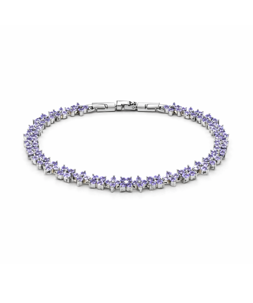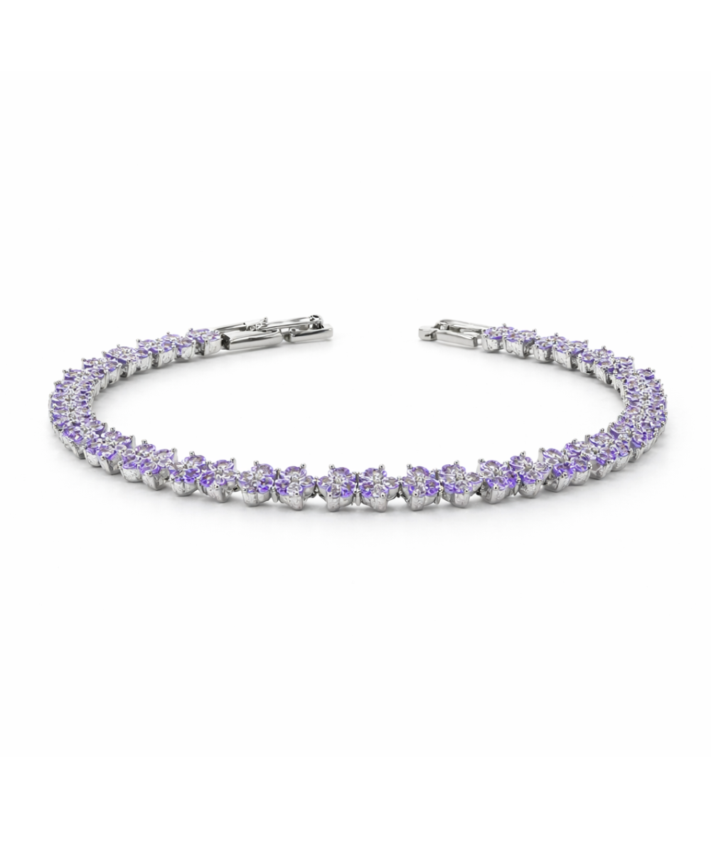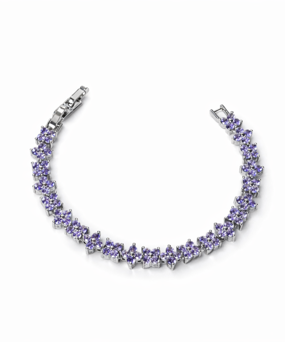 lavender crystal tennis bracelet crafted from 316 stainless steel, featuring a full line of floral cluster stones in a soft violet sparkle with a secure clasp finish, designed with a comfort-lightweight fit, all-day skin comfort, and long-lasting shine.