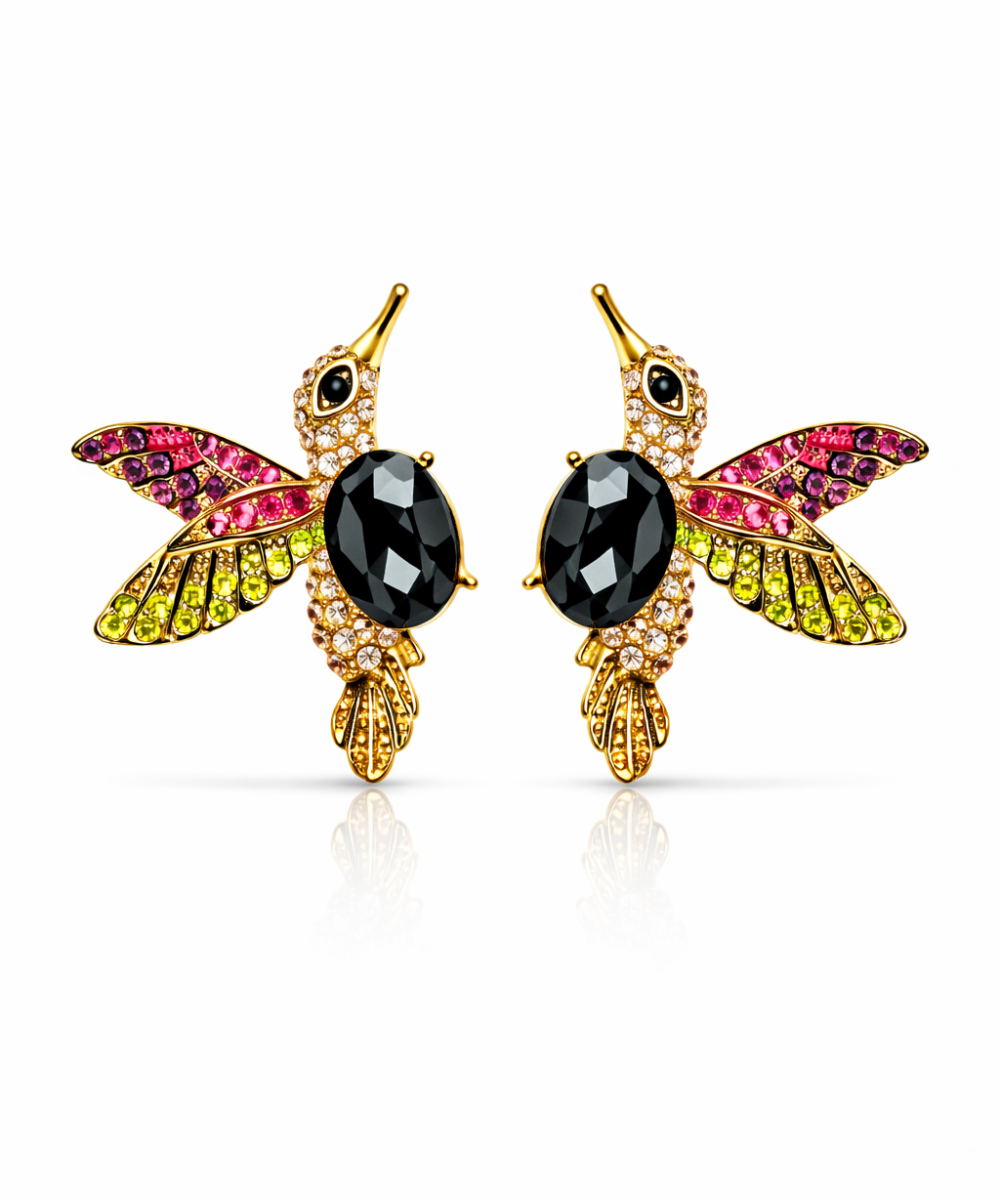 18K gold-plated multicolor hummingbird stud earrings crafted from 316 stainless steel, featuring a faceted black oval crystal centerpiece with pave crystal body detailing and vibrant wing accents in pink and olive-green stones, set in a polished gold frame, designed with a comfort-lightweight fit, all-day skin comfort, and long-lasting shine.