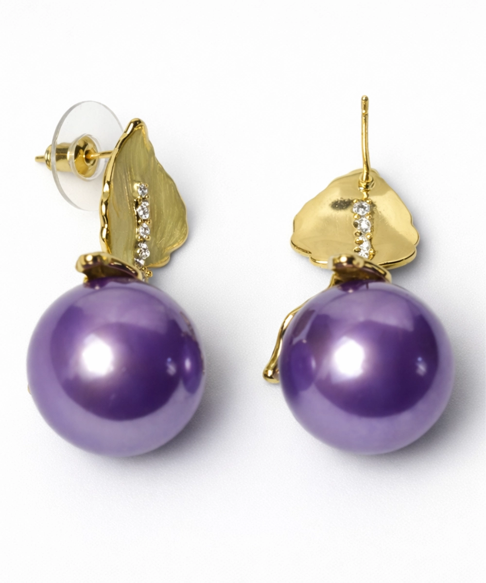Royal Purple Pearl Diamond Green Leaf Earrings
