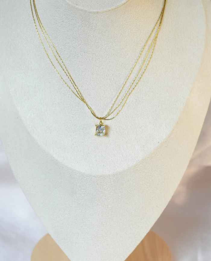Crafted in 316L stainless steel with an anti-tarnish nano layer, it features a sparkling square-cut crystal on a delicate triple-layer gold chain.