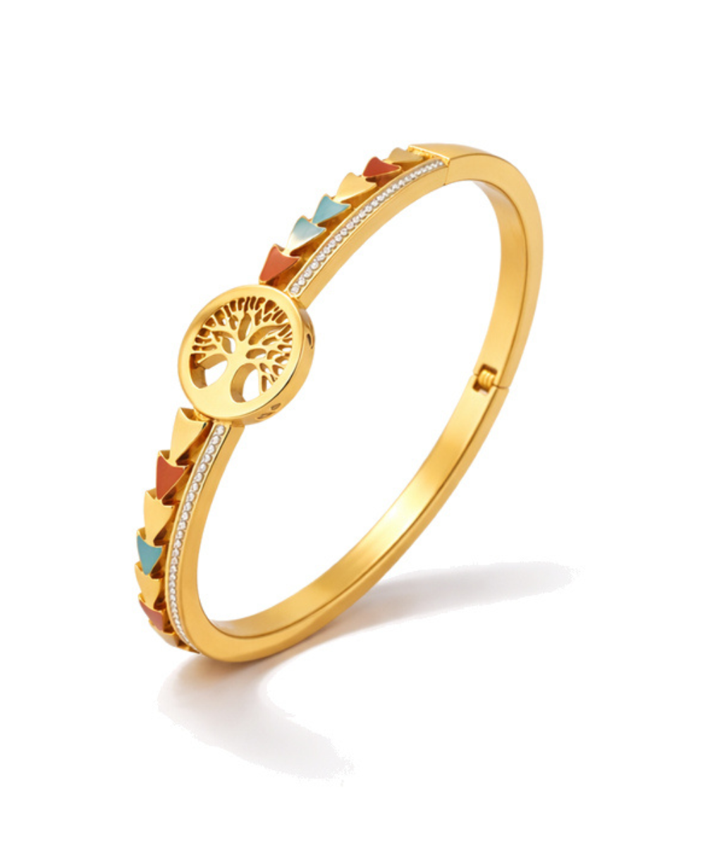 Embrace growth and positivity with the 18K Gold Plated Tree of Life Enamel Bangle from Aangan Studios.