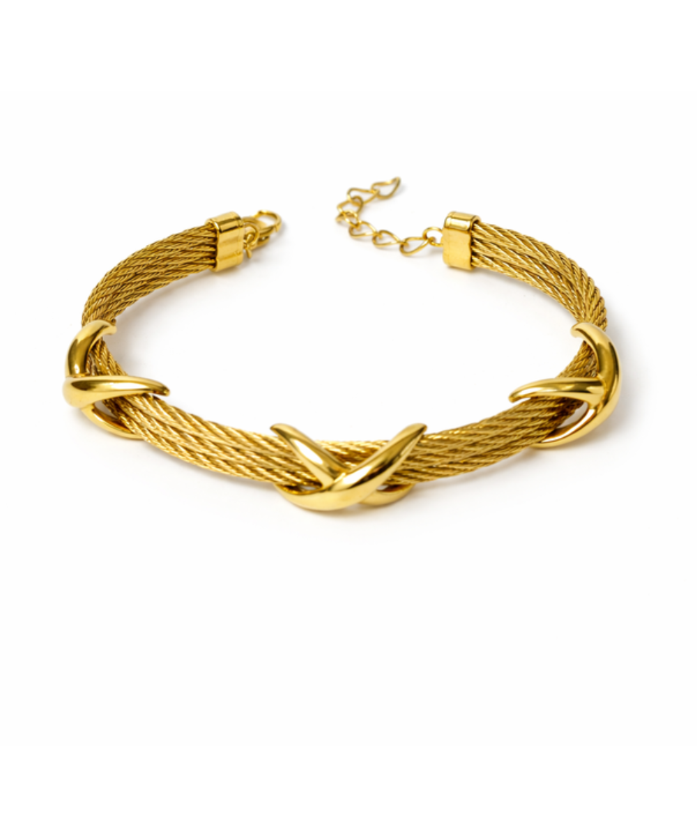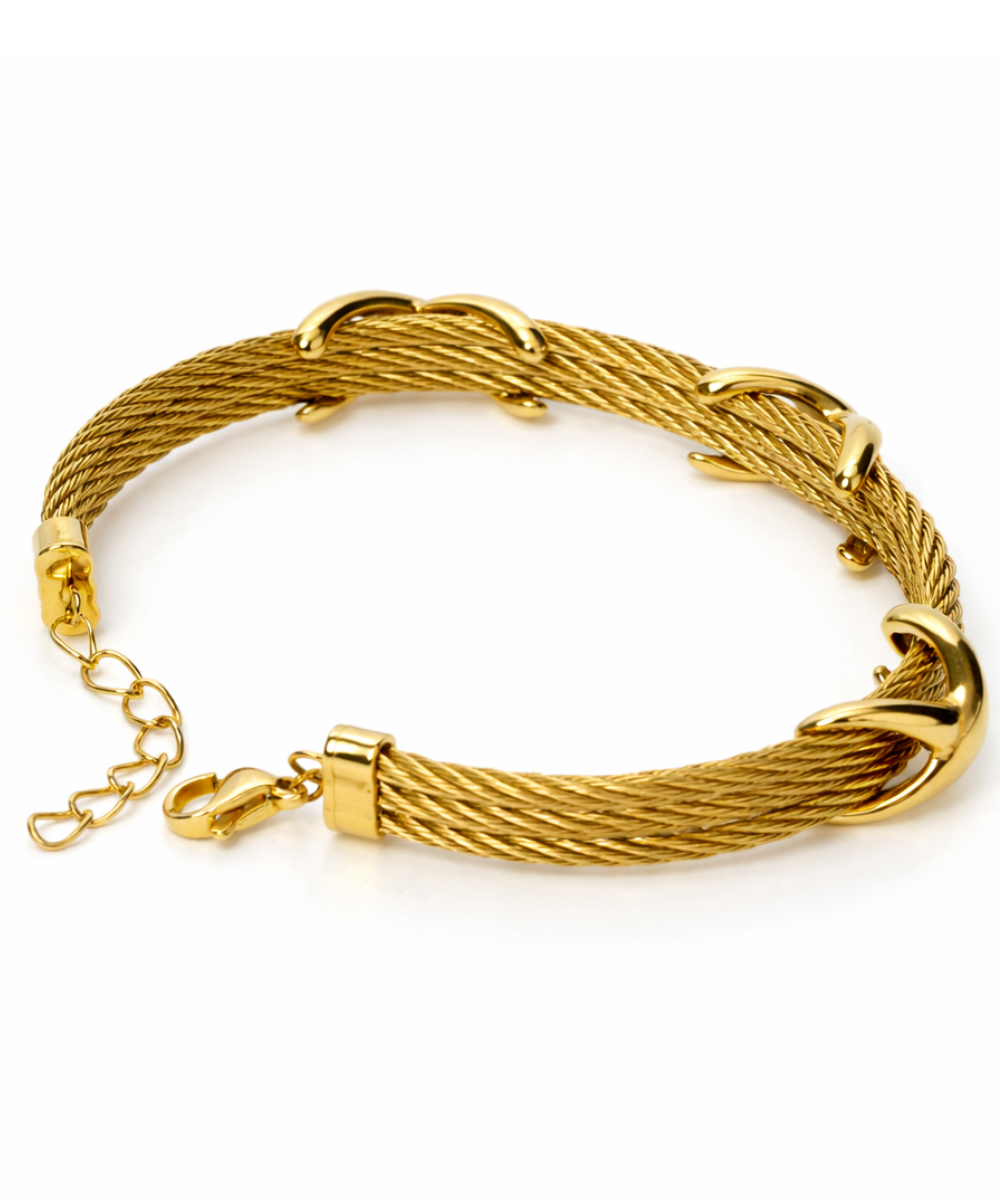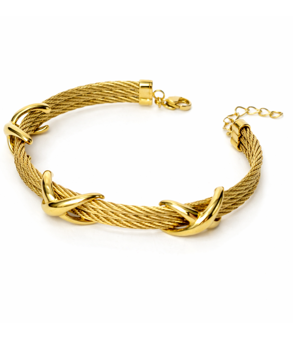 18K gold-plated twisted cable bracelet crafted from 316 stainless steel, featuring a multi-strand rope design with polished crossover knot accents and an adjustable extender chain for a secure fit, designed with a comfort-lightweight fit, all-day skin comfort, and long-lasting shine.
