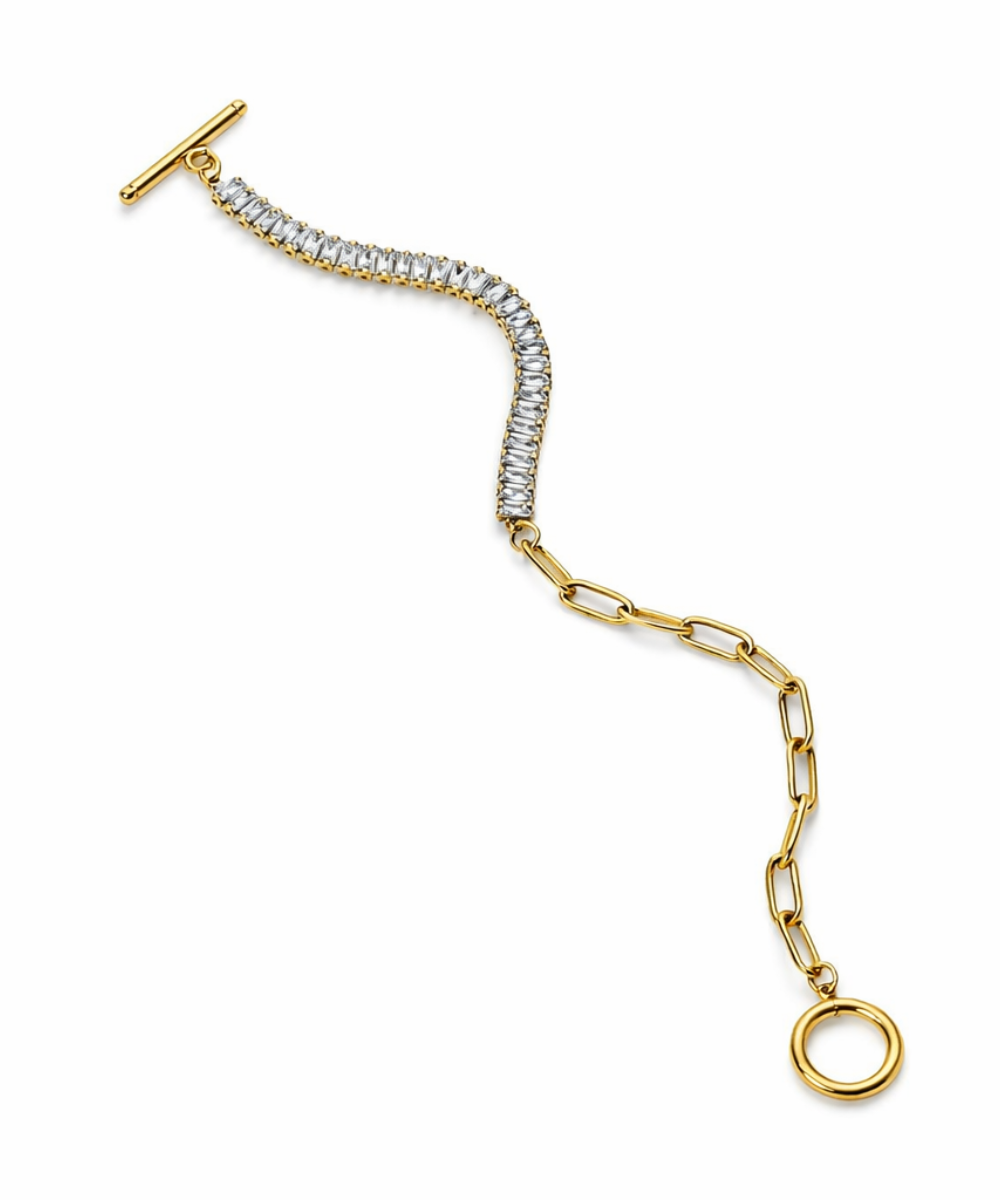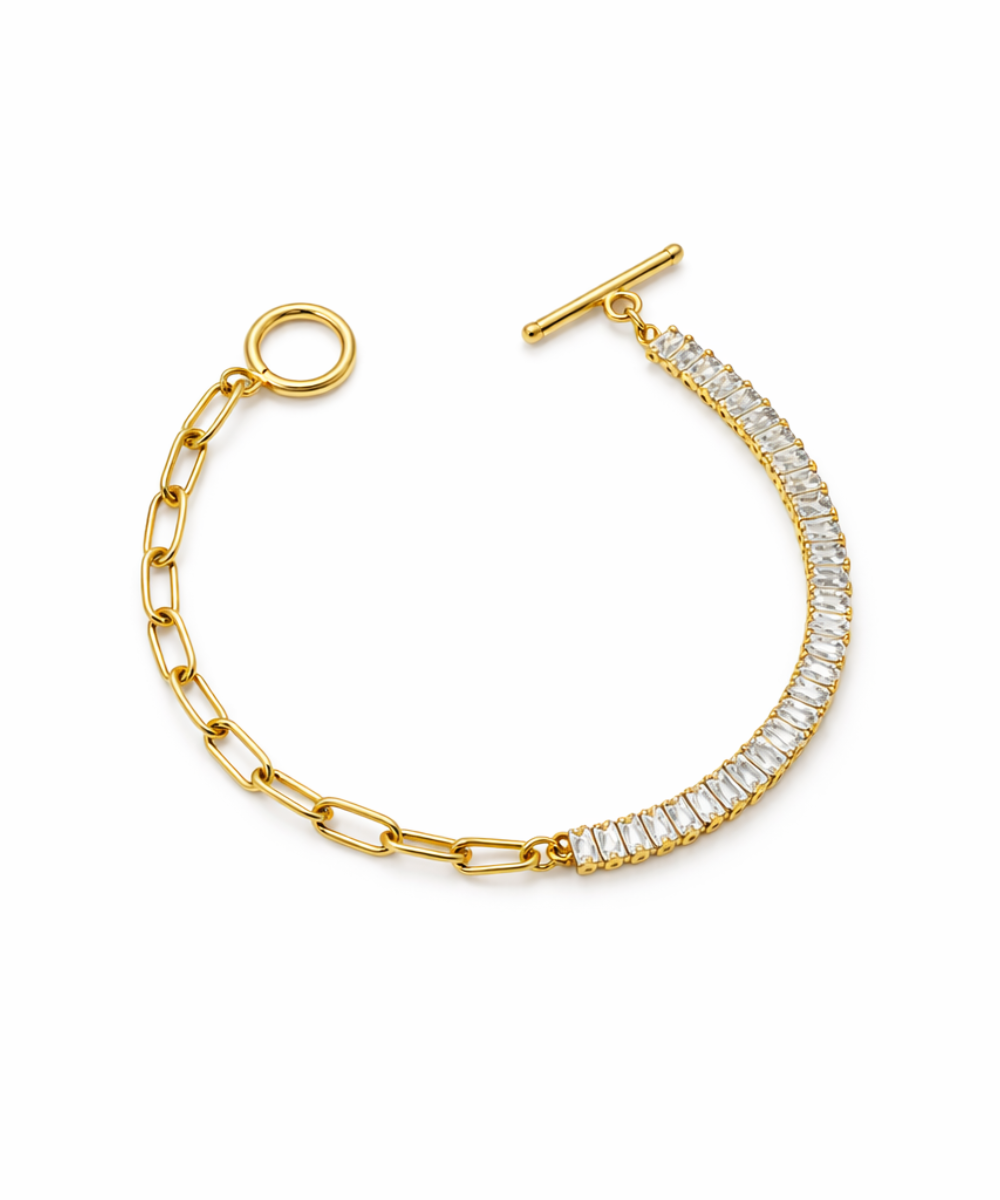 18K gold-plated half tennis chain bracelet crafted from 316 stainless steel, featuring a bold paperclip link chain paired with a sparkling baguette crystal row and a sleek toggle clasp finish, designed with a comfort-lightweight fit, all-day skin comfort, and long-lasting shine.