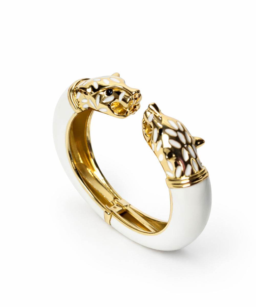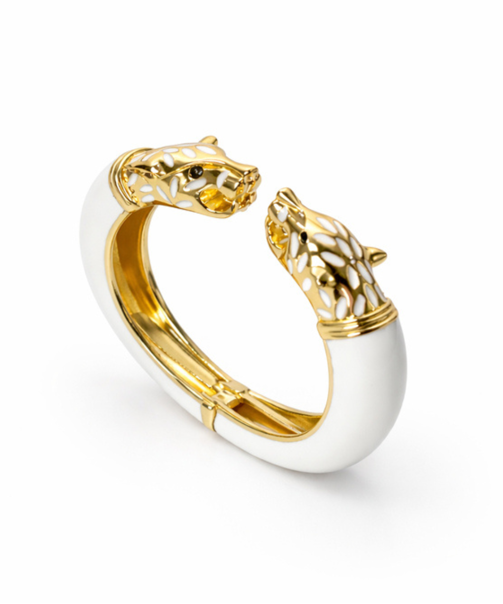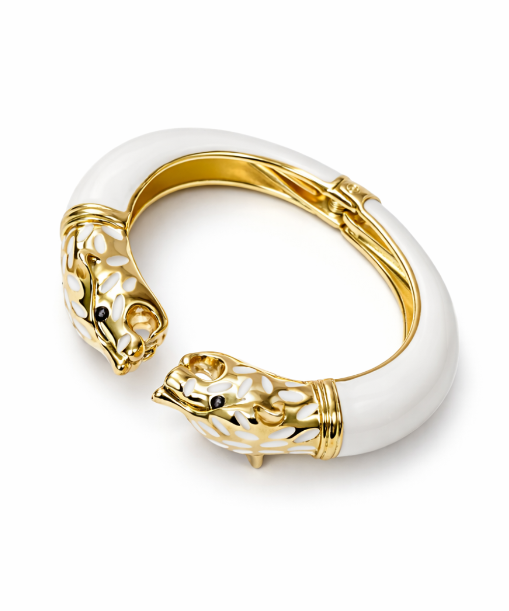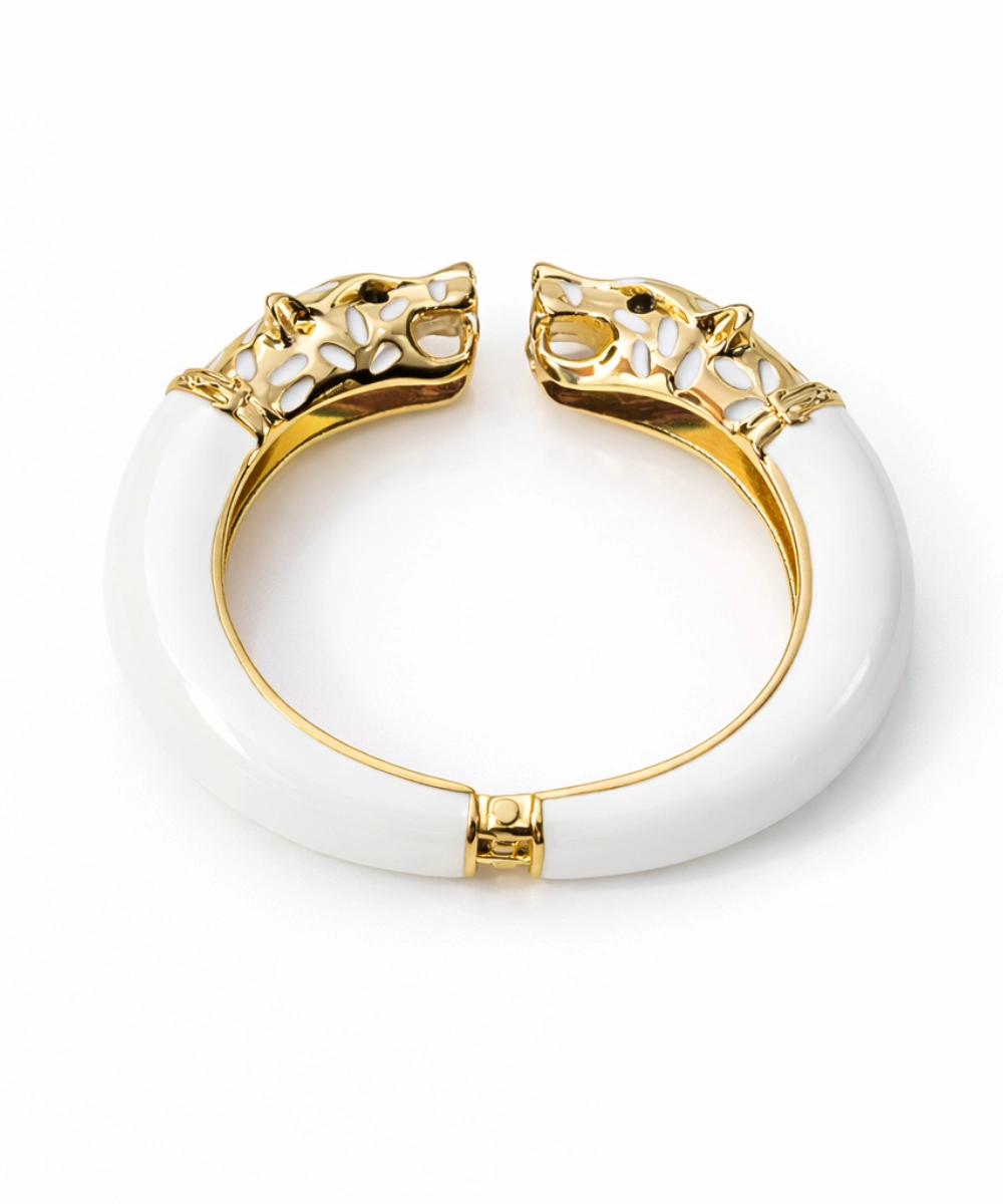 18K gold-plated panther cuff bracelet crafted from 316 stainless steel, featuring a bold White enamel band with dual panther head ends finished in polished gold and sleek black spotted detailing, designed with a comfort-lightweight fit, all-day skin comfort, and long-lasting shine.
